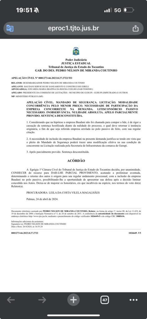 Após três anos de disputa judicial, a empresa Baudani Serviços de Saneamento e Construções Eireli (Baudani Ambiental), que faz parte do Grupo Tema, conseguiu reverter uma decisão que havia sido desfavorável em um processo licitatório no município de Gurupi. A 1ª Câmara Cível do Tribunal de Justiça do Tocantins (TJTO) acolheu o recurso e anulou a sentença anterior, determinando que o processo retorne ao juízo de origem para apreciação correta do recurso, com a participação da empresa no polo passivo.