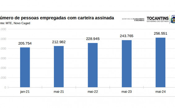 O estoque de empregos formais, que são aqueles com vínculos ativos, vem crescendo a cada ano. Por exemplo, em janeiro de 2021, era de 206 mil; em dezembro de 2023, atingiu 251.292; e em maio de 2024, chegou a 256. 551. Isto significa que, em maio de 2024, o Tocantins estava com um saldo de mais de 50 mil novos empregos gerados desde o ano de 2021.