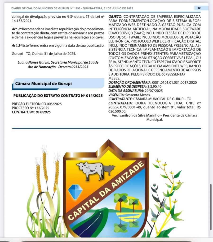 Sou cidadão de Gurupi e confesso que fiquei surpreso com a notícia de que a Câmara Municipal fechou um contrato de R$ 626.500,00 para contratar um sistema com inteligência artificial. A promessa é de modernizar processos, com votação eletrônica, certificação digital, suporte técnico e tudo mais.
