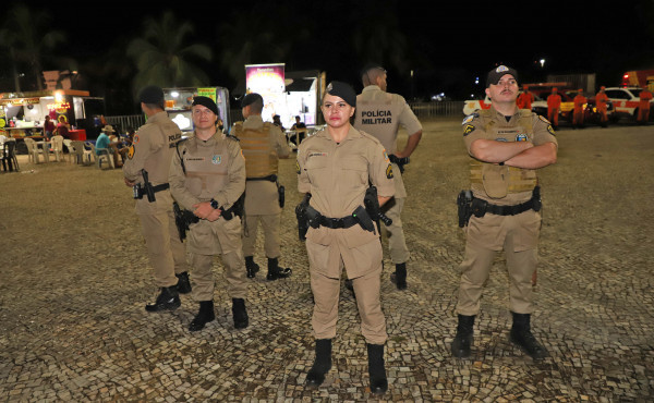 Policiais militares realizam patrulhamento durante o Carnaval na Praça dos Girassóis, em Palmas, garantindo um ambiente seguro para os foliões