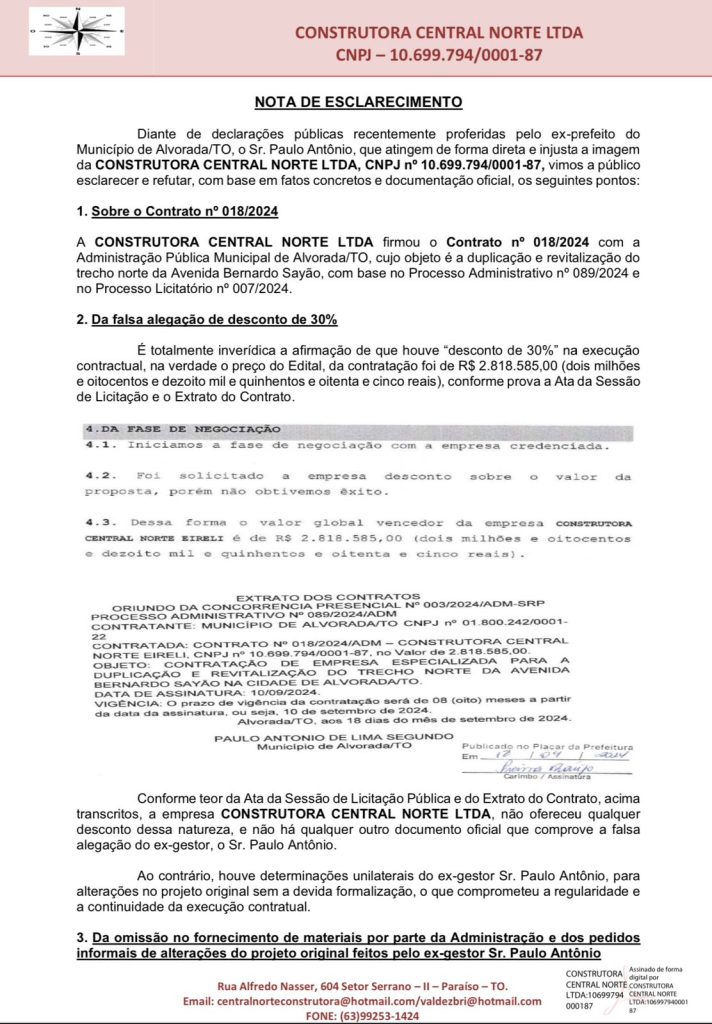 Segundo nota oficial emitida pela construtora, não houve qualquer tipo de desconto de 30% no valor do contrato, como afirmado pelo ex-gestor. O valor pactuado, de R$ 2.818.585,00, está registrado na Ata da Sessão de Licitação e no Extrato do Contrato, e corresponde integralmente ao que foi previsto no edital do processo licitatório nº 007/2024. A Central Norte ressaltou que não há nenhum documento oficial que comprove a alegação feita por Paulo Antônio.