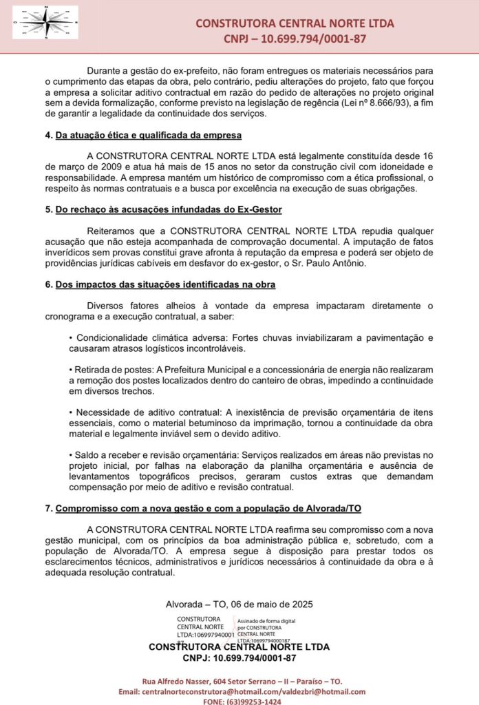Alvorada (TO) – A Construtora Central Norte LTDA veio a público nesta segunda-feira (6) contestar veementemente as declarações do ex-prefeito de Alvorada, Paulo Antônio, sobre a execução do contrato nº 018/2024, referente à duplicação e revitalização do trecho norte da Avenida Bernardo Sayão. A empresa classificou as acusações como falsas, infundadas e prejudiciais à sua reputação.