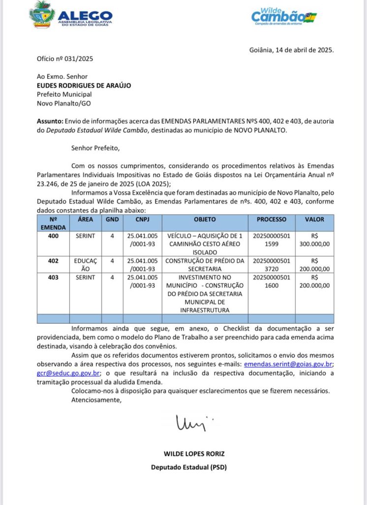 Novo Planalto (GO) – O município de Novo Planalto foi contemplado com R$ 700 mil em emendas parlamentares destinadas pelo deputado estadual Wilde Cambão (PSD). As verbas fazem parte das Emendas Impositivas previstas na Lei Orçamentária Anual de 2025 e visam fortalecer a infraestrutura e os serviços públicos locais.