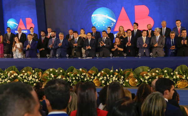 O governador do Tocantins, Wanderlei Barbosa, acompanhado da primeira-dama e secretária extraordinária de Participações Sociais, Karynne Sotero, participou nessa quinta-feira, 20, em Palmas, da solenidade de posse da nova gestão da Ordem dos Advogados do Brasil – Seccional Tocantins (OAB-TO) para o triênio 2025-2027. Na ocasião, tomaram posse o presidente Gedeon Pitaluga e a vice-presidente Larissa Carlos Rosenda.