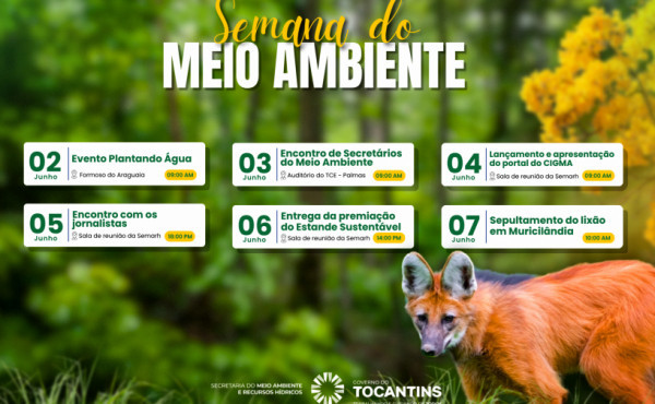 O Governo do Tocantins, por meio da Secretaria de Estado do Meio Ambiente e Recursos Hídricos (Semarh), realizará entre os dias 2 e 7 de junho, a Semana do Meio Ambiente. O evento contará com uma agenda estratégica, articulada entre o poder público estadual, municípios, instituições de controle e sociedade civil.