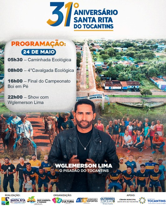 Santa Rita do Tocantins (TO) – O município de Santa Rita do Tocantins se prepara para celebrar seu 31º aniversário no próximo dia 24 de maio com uma programação diversificada que une esporte, cultura e lazer. As atividades começam logo nas primeiras horas do dia e se estendem até a noite, culminando em um show do cantor Wglemerson Lima, conhecido como “O Pisadão do Tocantins”.