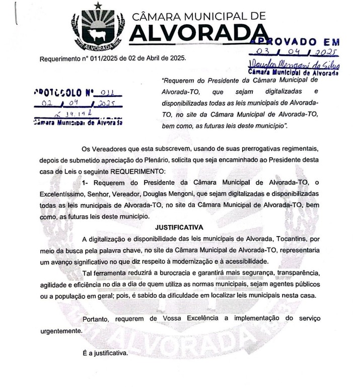 Alvorada (TO) – Em busca de maior transparência e eficiência na gestão legislativa, os vereadores Leonardo Rinaldi, Matheus Tavares e Djalma Falcão apresentaram, no dia 2 de abril de 2025, o requerimento nº 011/2025, solicitando a digitalização e a publicação de todas as leis municipais de Alvorada no site oficial da Câmara Municipal.